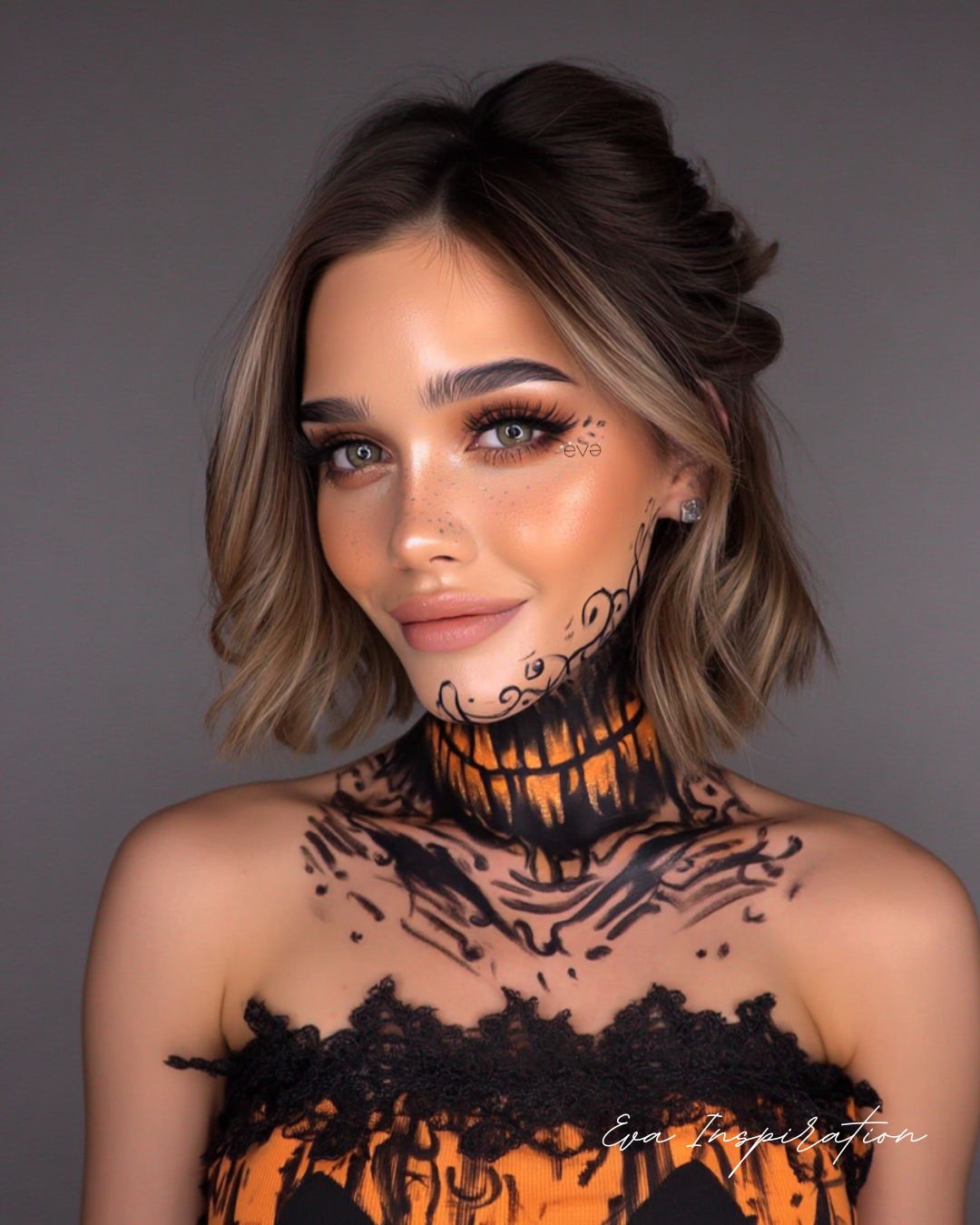 Mais ici, la version est plus mode que scary. Peau dorée, taches de rousseur, yeux lumineux. Le buste et le cou deviennent une œuvre d’art, peints façon citrouille glamour, soulignés de noir comme un tatouage graphique. La robe joue l’orange et le noir en contraste dentelle. Un look solaire, presque doux, mais parfait pour Halloween.