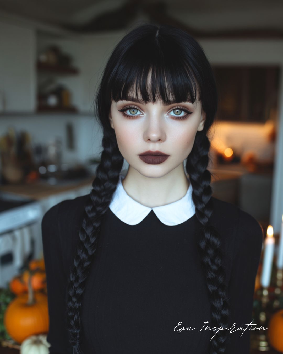 Tresses noires serrées, frange droite, robe stricte à col blanc… Le look Wednesday est reconnaissable entre mille. Ici, la version se veut plus moderne : maquillage sombre, lèvres prune mates et regard intense.