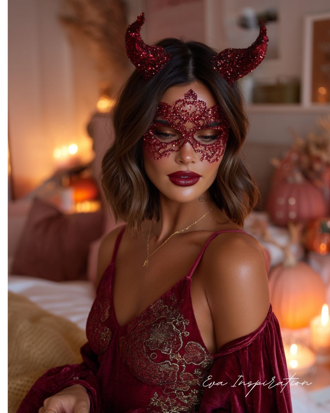Un classique revisité, version chic. Une robe en velours bordeaux, des détails dorés subtils, et surtout un maquillage travaillé : lèvres rouges glossy, masque arabesque scintillant, et cornes incrustées de paillettes. Le décor joue aussi : citrouilles pastel, bougies, ambiance feutrée.
