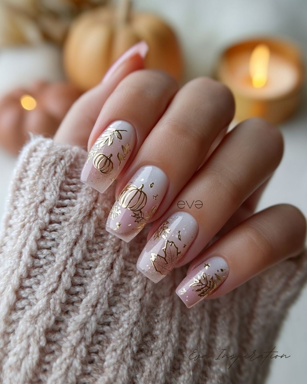 Ongles Halloween beige et doré avec feuilles et citrouilles – nail art automnal.
