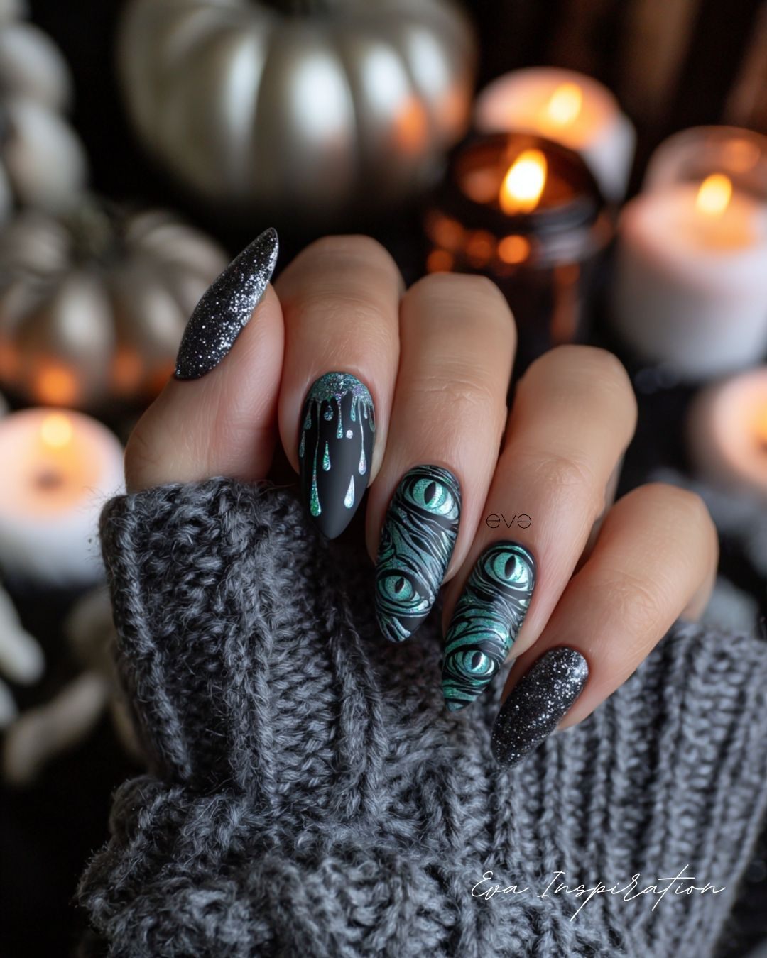 Plus audacieux, ce nail art joue avec le noir profond et le vert métallique. Des yeux mystérieux se répètent comme un motif de velours, entourés de paillettes et de coulures brillantes. Un style intense, parfait pour celles qui veulent marquer la soirée.