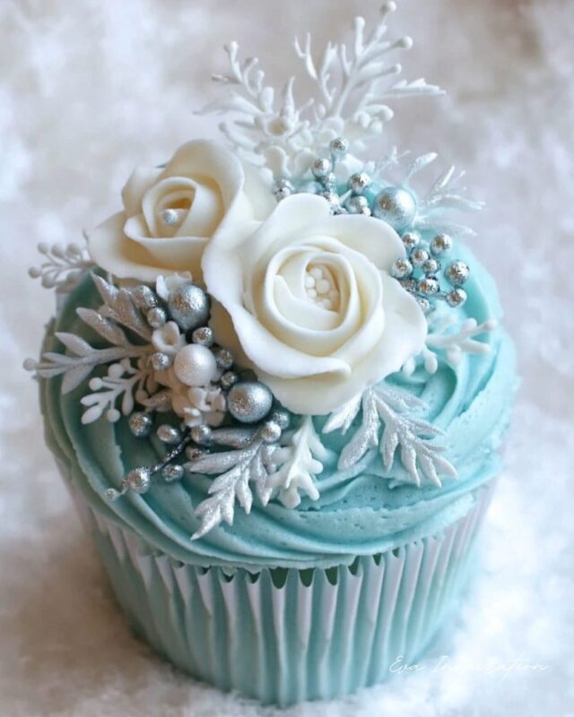 Bleu glacier. Roses en sucre blanc ivoire. Feuilles givrées qui semblent sculptées dans la lumière. Ce cupcake n’imite pas Noël. Il l’élève. Chaque détail est ciselé, argenté, froid mais somptueux. L’élégance polaire. Une pièce maîtresse, presque trop parfaite pour être mangée.