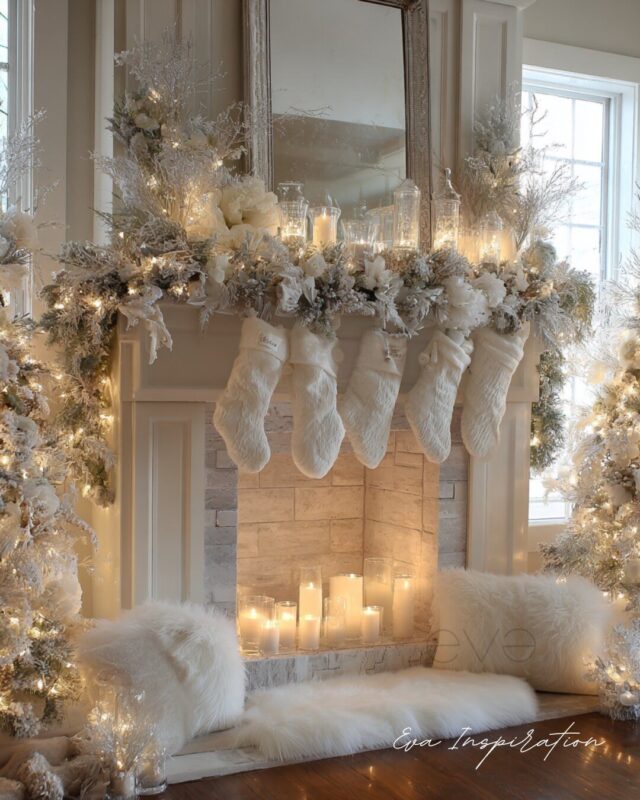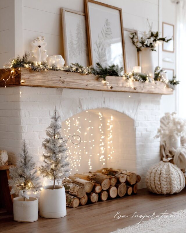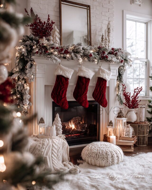 Ici, tout joue sur le blanc doux et lumineux. Branchages givrés, fleurs en velours, chaussettes de Noël moelleuses. Et en dessous, pas de feu — juste une collection de bougies LED alignées comme un mini feu magique. Sans risque. Sans fumée. Parfait pour un coin détente avec coussins moelleux et fausse peau de bête.