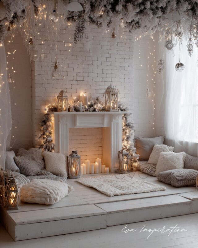 Des murs en briques blanches, un sol peint assorti, des lanternes posées comme des sculptures. Ici, tout est dans la texture : plaids torsadés, coussins moelleux, tapis en laine. Et au centre, une cheminée stylisée, remplie de bougies LED, entourée de guirlandes et branches givrées. Le tout baigne dans une lumière douce, presque irréelle. Un coin lecture ? Un cocon pour l’hiver ? C’est les deux à la fois.