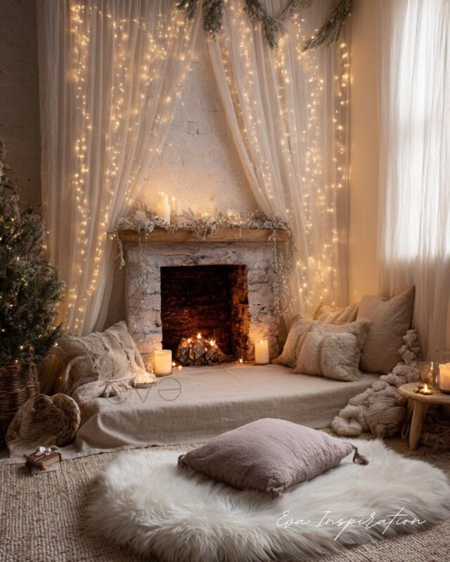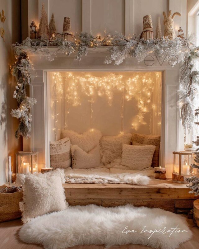 Quand la fausse cheminée devient alcôve. Ici, pas de feu, mais un nid doux rempli de coussins, de plaids et de guirlandes lumineuses. Tout en beige, bois brut et blanc neige. C’est une cachette enchantée, à mi-chemin entre cabane secrète et coin lecture hivernal. L’esprit de Noël version slow, pour celles et ceux qui rêvent d’un intérieur doux comme un murmure.