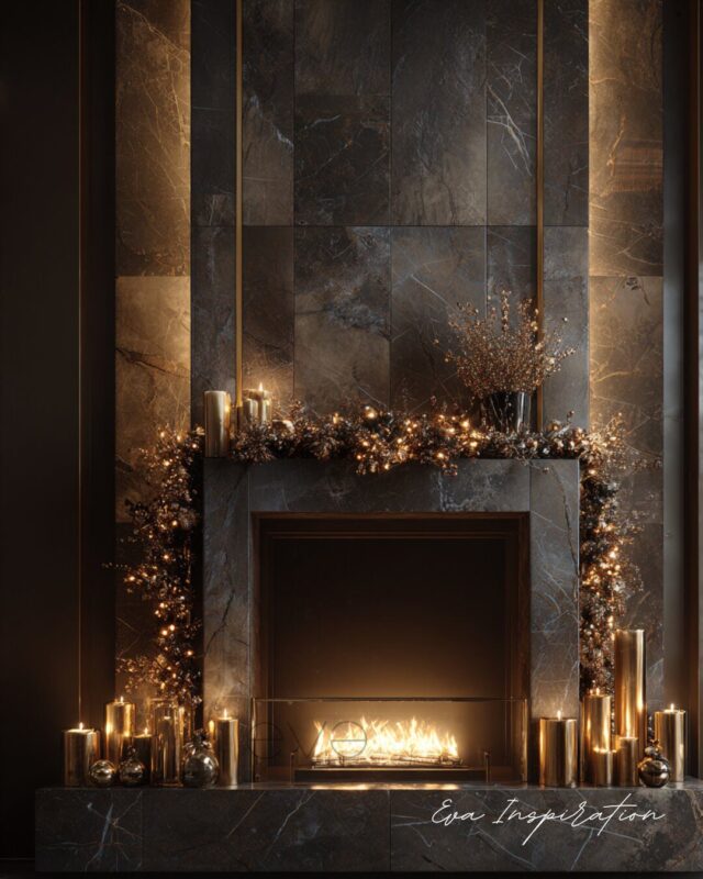 Ici, la magie de Noël épouse les lignes d’un intérieur d’architecte : cheminée encastrée dans une paroi en marbre sombre, touches métalliques, lumière dorée maîtrisée.