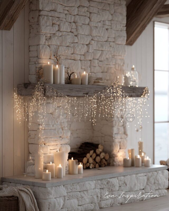 C’est doux. C’est brut. Et c’est exactement ce qu’on attend d’un coin cheminée quand Noël approche. Des pierres blanches irrégulières, du bois clair, une guirlande façon pluie d’étoiles et une accumulation de bougies beiges. Pas de rouge criard. Pas de paillettes inutiles. Juste une atmosphère. Authentique. Silencieuse. Parfaite pour celles et ceux qui veulent une déco de fête sans trop de détails. Ici, même les flammes semblent chuchoter.