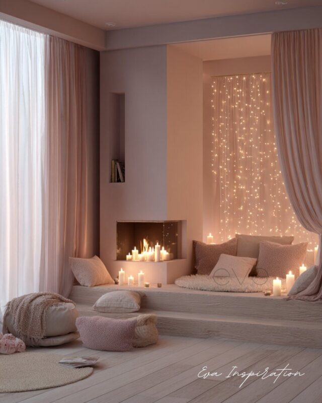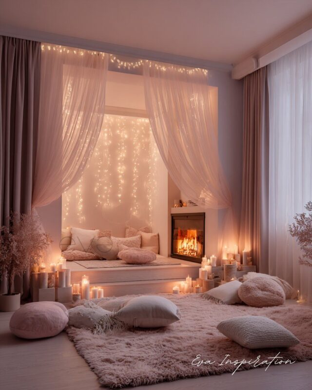 Ici, tout repose sur la lumière : une cheminée encastrée moderne, une ligne de bougies LED, des coussins moelleux posés au sol, et au fond, une cascade de guirlandes lumineuses.