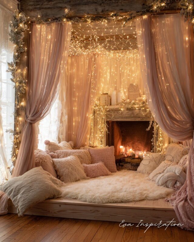 Rose poudré, guirlandes suspendues, rideaux vaporeux… Cette mise en scène transforme la cheminée en alcôve féerique. Un lit de coussins moelleux invite à s’y blottir, entre plaids texturés et lumière dorée. Le feu n’est plus central, c’est l’ambiance qui enveloppe. Une inspiration douce et théâtrale, parfaite pour une déco de Noël romantique et réconfortante.