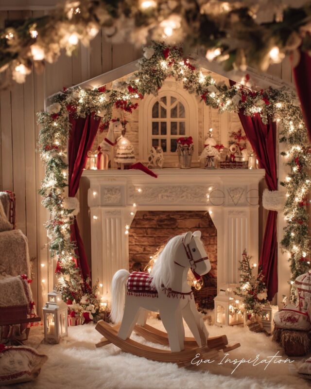 Tout y est : le cheval à bascule, les rideaux rouges, les guirlandes au parfum d’antan. Cette cheminée décorée comme une petite maison de poupée plonge la pièce dans un univers de Noël intemporel, doux et magique. L’esprit chalet rencontre l’enfance, pour un décor qui raconte une histoire à lui tout seul.
