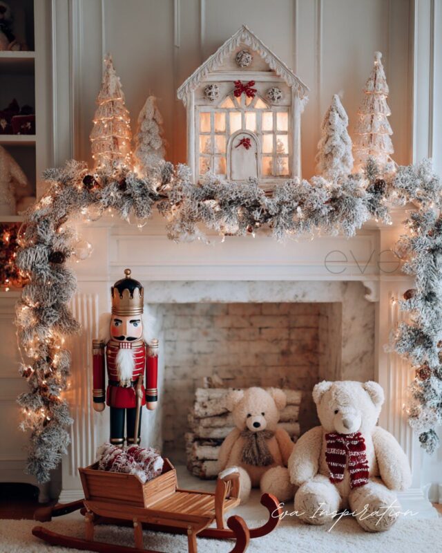 Coin cheminée enchanté avec oursons, luge et Casse-Noisette géant