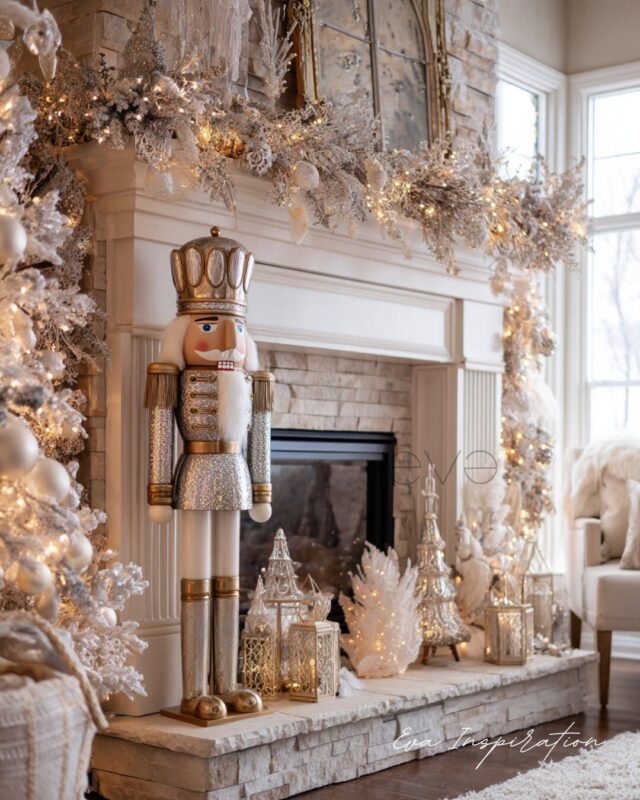 Ici, la cheminée devient un théâtre d’hiver chic et grandiose. Couronne de guirlandes givrées, lanternes dorées, soldats scintillants. Une ambiance digne d’un conte de Noël, pensée dans les moindres détails – mais 100 % LED.