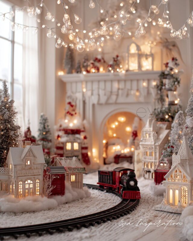 Un petit train rouge file entre des maisons lumineuses, comme dans un conte animé. À l’arrière, la cheminée devient décor de théâtre, encadrée de guirlandes douces et de lumières féeriques. Chaque détail évoque un Noël d’antan, revisité avec magie.
