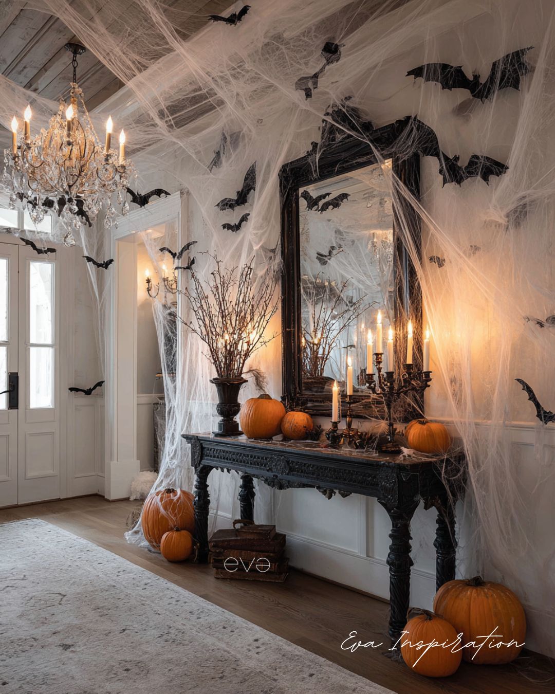 Des bougies alignées devant un miroir baroque, des corbeaux perchés qui semblent surveiller l’entrée. La console blanche disparaît sous les toiles, les citrouilles complètent l’ensemble. Un décor élégant, sombre et raffiné, juste après avoir franchi la porte.