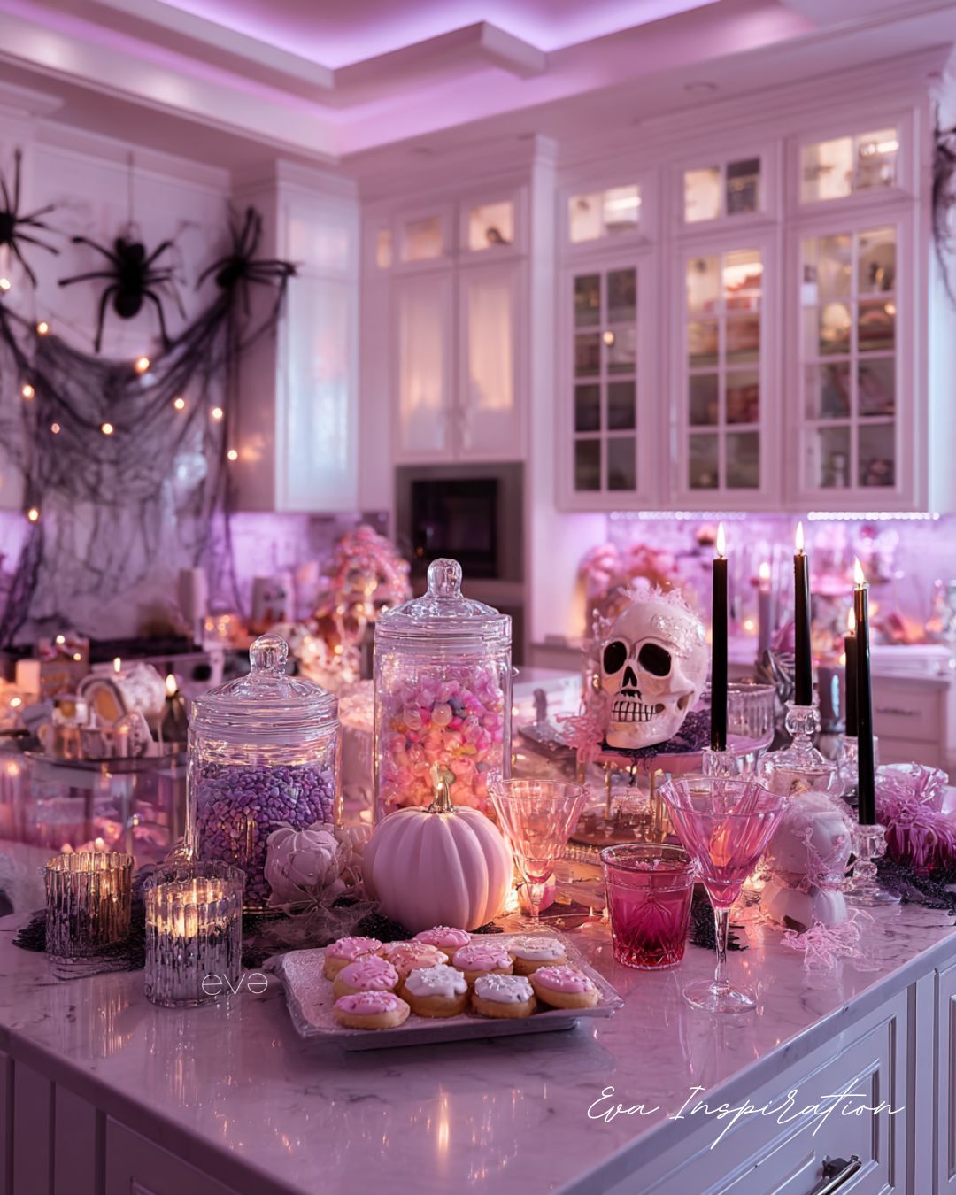Plus glamour, la lumière vire au rose. Les bonbonnières débordent de sucreries pastel, les citrouilles s’habillent de blanc nacré, les crânes s’ornent de perles. Autour, des cocktails et des biscuits roses complètent l’ambiance. La cuisine devient un laboratoire chic et festif, entre douceur et frisson.