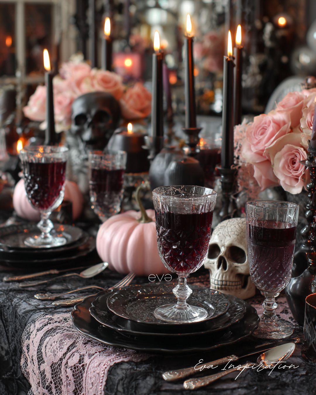 Puis vient la version glamour. Le noir reste, mais il se mêle au rose poudré : bouquets de fleurs, citrouilles pastel et verres de vin rouge qui brillent dans la pénombre. La table devient plus mystérieuse, élégante, presque romantique, tout en gardant ce petit frisson d’Halloween.