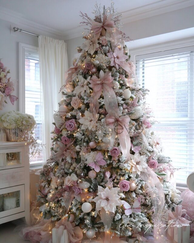 Du rose poudré, des fleurs satinées, des rubans fluides… Ce sapin fait la part belle à la douceur. Chaque détail semble soufflé par l’hiver : poinsettias, papillons délicats, feuillage givré. L’ensemble crée une atmosphère romantique et apaisante…. Une idée de décoration tendance, délicate et visuelle, dans l’univers d’Eva Inspiration.