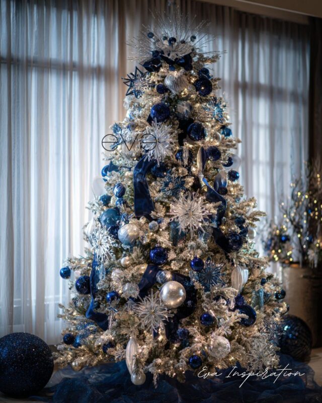 Loin des palettes classiques, ce sapin fait le pari du bleu intense. Un bleu roi presque électrique, adouci par les reflets givrés de l’argent. Les flocons démesurés, les boules oversize et les rubans satinés transforment le salon en scène féerique.