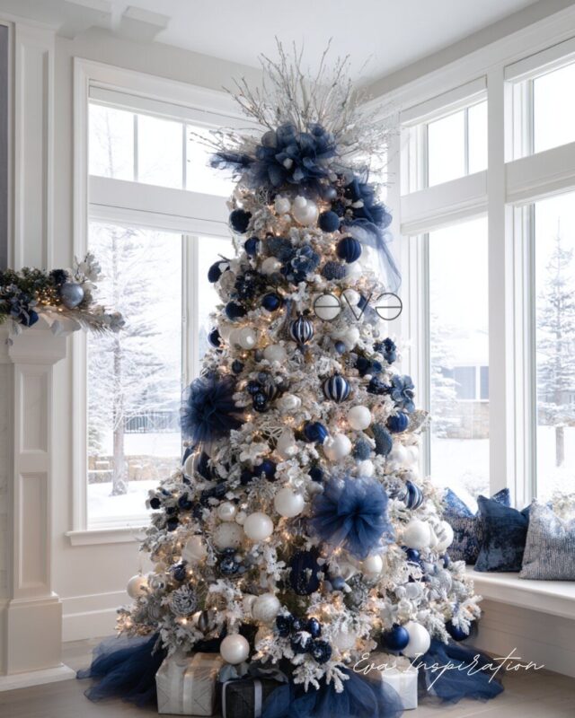 Ici, tout est dans le contraste. Le bleu nuit, profond et velouté, tranche avec le blanc givré des branches. Le tulle ajoute une touche aérienne. Les boules scintillent comme des flocons de minuit. C’est une idée de sapin élégante et tendance, loin des codes classiques. Un style raffiné, parfait pour un intérieur clair et moderne.