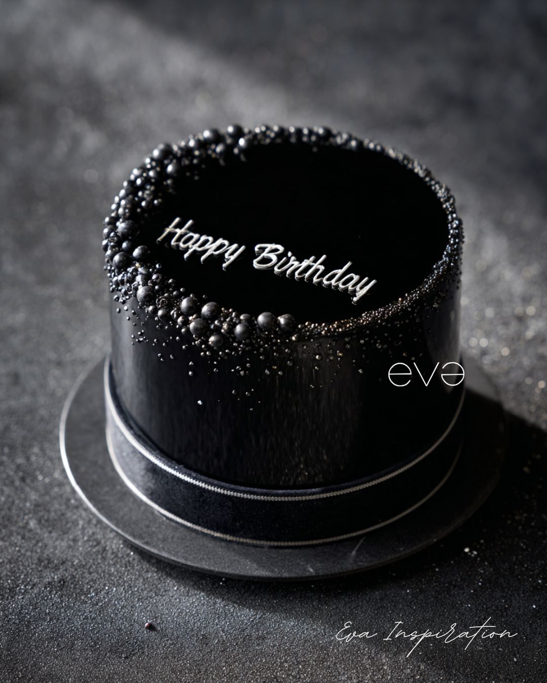 Des gâteaux foncés, noir ou bleu nuit, avec une petite écriture dorée ou argentée.