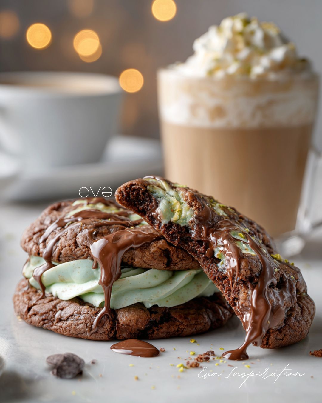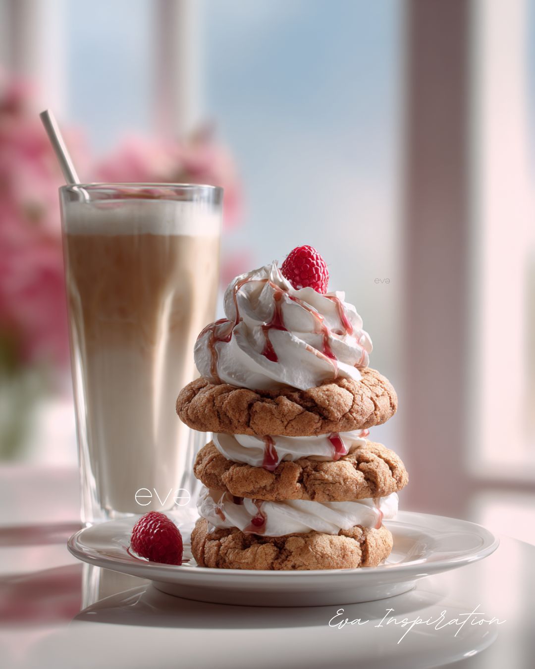 Deux ou trois cookies moelleux, superposés avec une crème légère (vanille, mascarpone fouettée ou chantilly ferme).