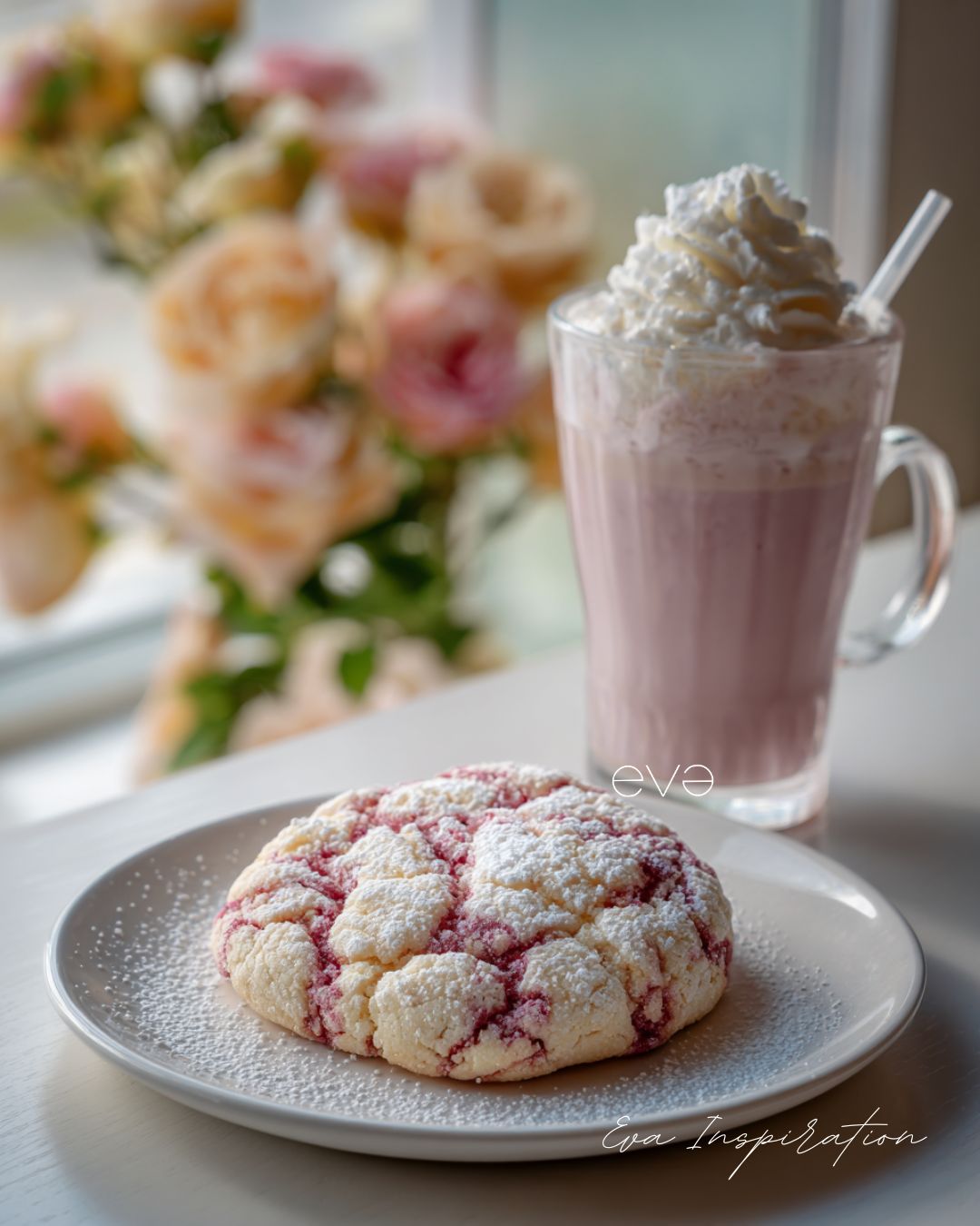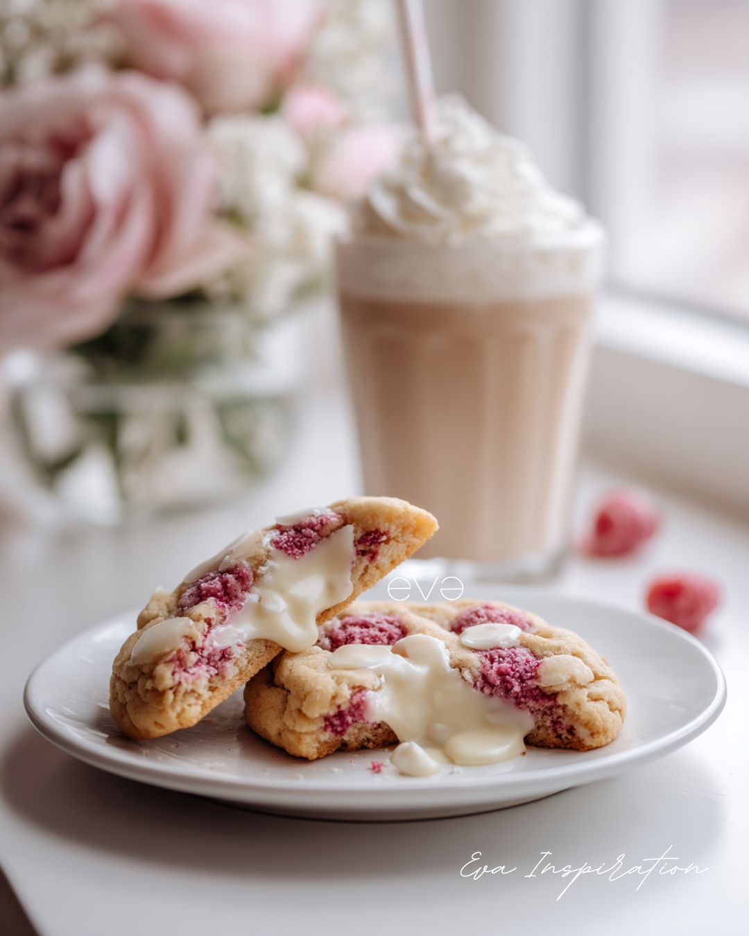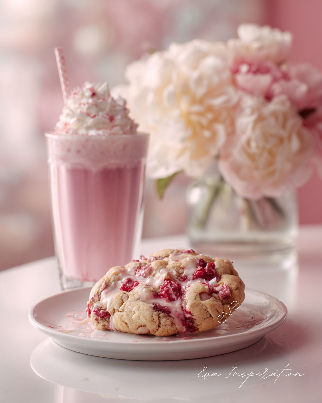 Cookies moelleux aux tons pastel, entre rose framboise et lilas myrtille. La pâte reste claire, épaisse, avec les morceaux de chocolat blanc visibles en surface. On les présente dans une assiette blanche, lumière douce, toujours avec une boisson assortie (milkshake rose, latte vanille ou boisson violette très légère).