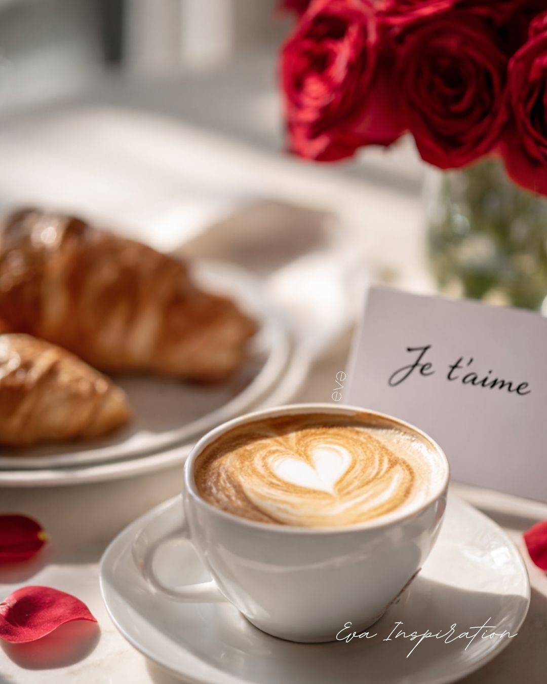Des pétales de rose au milieu du petit-déjeuner. Un café décoré d’un petit cœur. Un petit mot je t’aime.