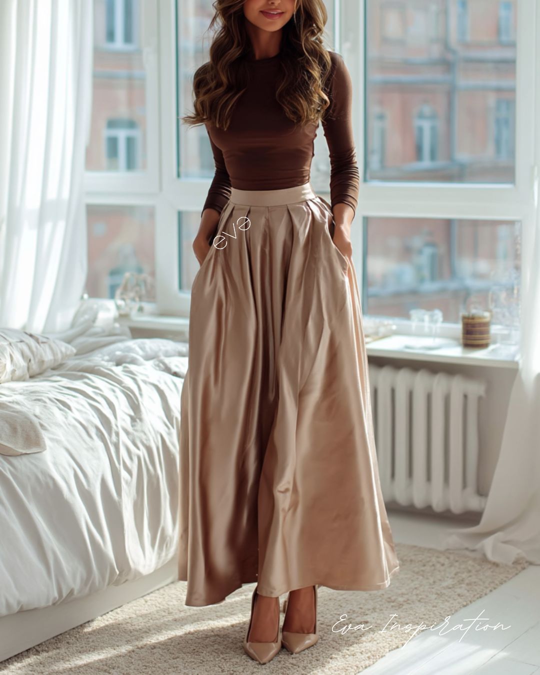 Un duo qui fonctionne immédiatement. Le chocolat chaud du haut, le satin lumineux en bas. C’est doux, enveloppant, un peu mystérieux. Comme si on se préparait à une Saint-Valentin tranquille, mais finalement très stylée.