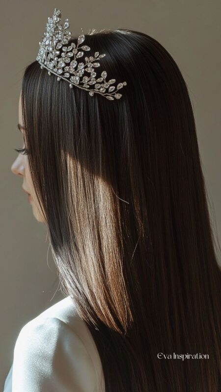 Pour une mariée de conte de fées moderne, les cheveux sont laissés longs, lisses et brillants, ornés simplement d’une tiare en strass. Un look digne d’une princesse, entre classicisme et élégance intemporelle.