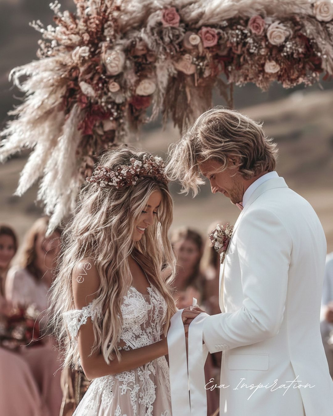 La table à rituel est le cœur poétique de votre cérémonie laïque. Qu’il s’agisse du rituel du sable, de l’eau, des pierres ou des bougies, elle se transforme en véritable écrin pour vos symboles d’amour. Une table élégante, joliment décorée avec vases, bougies, fleurs et rubans, permet de mettre en valeur chaque geste et chaque élément du rituel. L’idée est de jouer sur les textures, les couleurs douces et les détails bohèmes : des fleurs délicates, des tissus fluides, des pierres colorées ou des bougies parfumées créent un décor à la fois intime et photogénique, parfait pour sublimer vos photos et garder un souvenir poétique de ce moment unique.