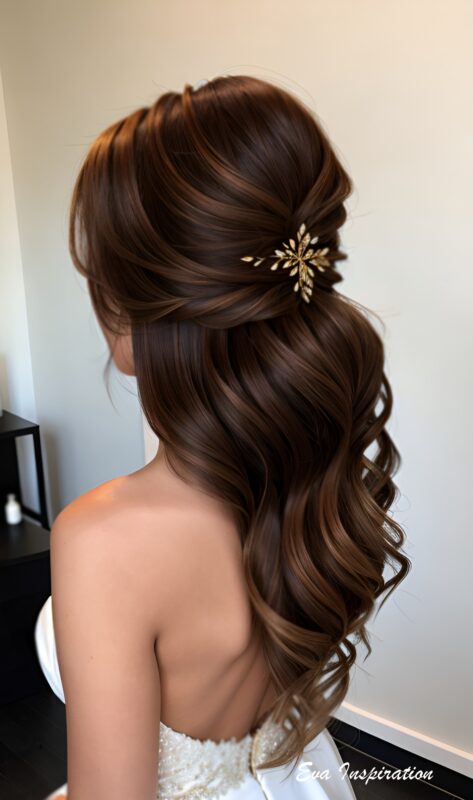 La coiffure semi-lâchée reste une valeur sûre pour 2025, surtout lorsqu’elle est associée à un accessoire délicat. Ce style combine la liberté de cheveux lâchés et la sophistication d’un détail raffiné. Que ce soit avec un peigne à cheveux incrusté de perles ou une barrette ornée de cristaux, ce look respire la modernité tout en gardant une certaine simplicité.