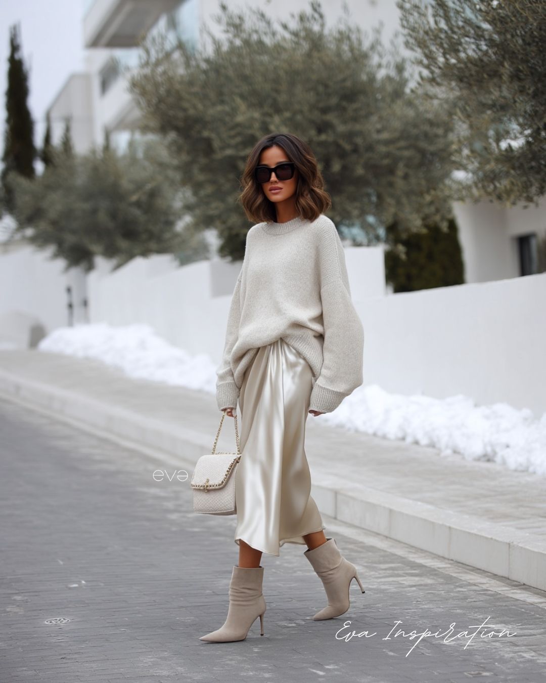 Douceur et contraste. Le satin capte la lumière, la maille adoucit l’ensemble. Cette tenue joue sur les matières : un pull crème loose, une jupe fluide, des bottines en daim.