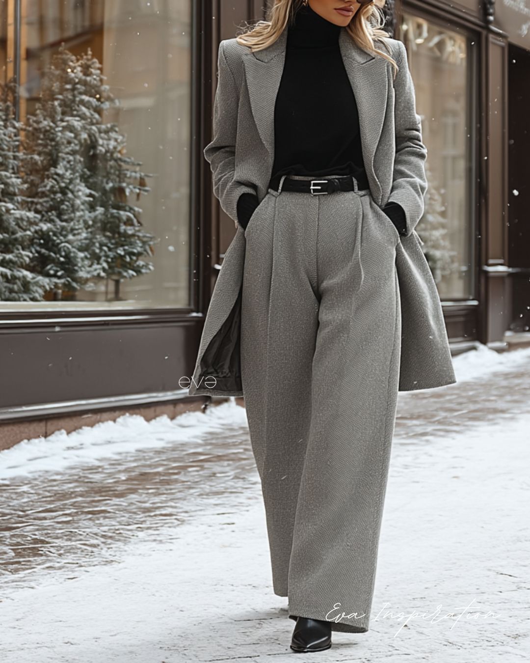 Classique, mais indémodable. Un manteau long coordonné au pantalon large, un col roulé noir et des bottines nettes. Les mains dans les poches, la démarche fluide.