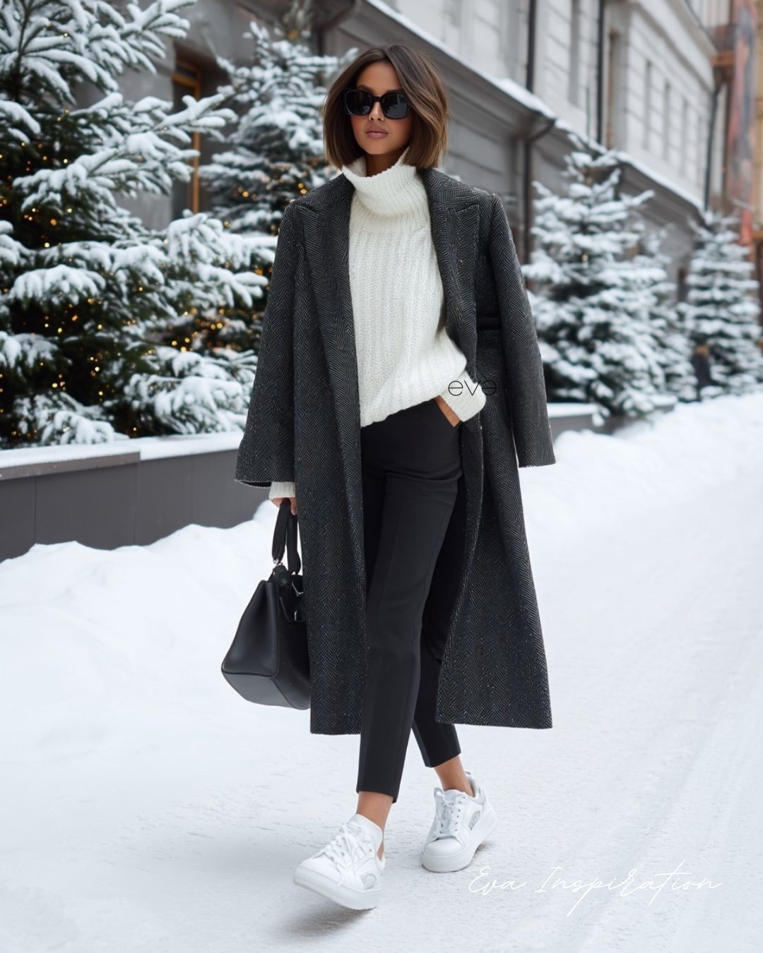 Sobriété totale. Un manteau long anthracite, un pull col roulé crème, un pantalon noir et une paire de baskets blanches.